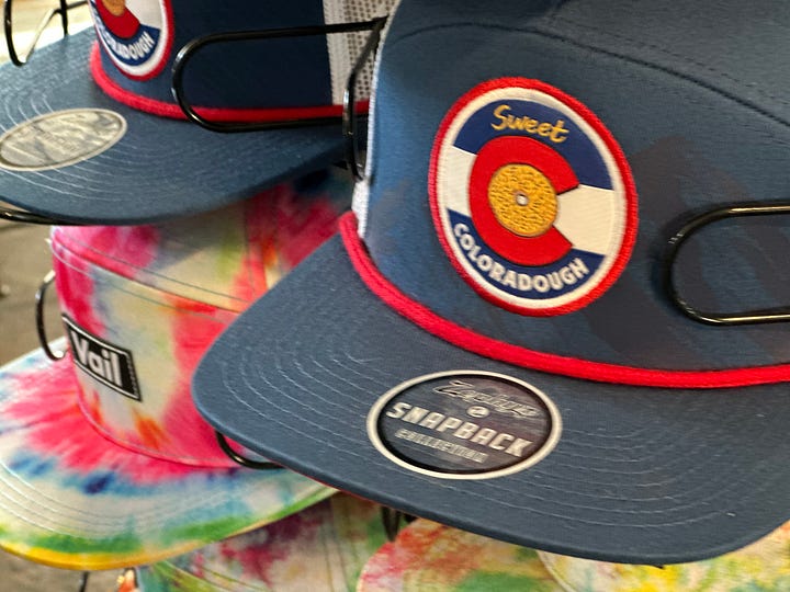 The building is unassuming. A modified A-Frame with a 70s style bus parked out front, both painted with red, yellow, and blue Colorado flags and adorned with images of doughnuts and mountain scenery. Yet one step inside and you will quickly realize this is a popular place for a reason. The line usually starts out of the door, and it serpentines around shelves filled with Colorado souvenirs. Funny hats, t-shirts, and socks help set the mood for the morning fun.